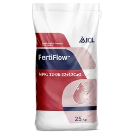Fertiflow 12-6-22+12CaO is a calcium-enriched NPK fertilizer designed for early vegetative growth and structural strengthening. Calcium promotes proper cell elongation, strengthens cell walls, and enhances resistance against stress, diseases, and pests. Ideal for fertigation programs requiring balanced nutrition with added calcium support.