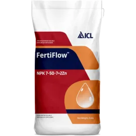 Fertiflow 7-50-7+2Zn is a phosphorus-rich fertilizer fortified with Zinc to enhance yield and crop quality. Zinc improves enzyme activity and nutrient utilization, ensuring uniform growth and better produce quality, especially in intensive cropping systems.