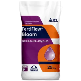 Fertiflow Bloom 8-24-24+4MgO+6S is a low-nitrogen fertilizer developed for flowering and fruiting stages. Magnesium enhances chlorophyll production and photosynthesis, while Sulphur supports protein synthesis and yield improvement.