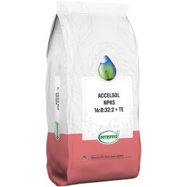 Stage specific and optimum supplementation of nutrition allows farmers to maximise yields across all the crop Advantages of AccelSol Setting and Fruiting NPKS 16:8:32:2 + TE: Water-soluble NPK + TE Unique NUE Technology Made of high-quality ingredients Consists of 100% plant nutrients Provide balanced and complete plant nutr..